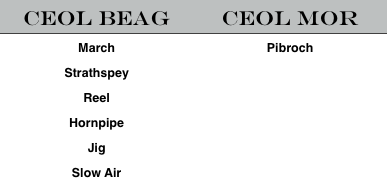 Or imagine every ceol beag played in exactly the same style: e.g., all marches, strathspeys, reels, jigs and hornpipes played and competed as slow airs.
