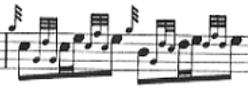 Note how in the primary source examples weight is given to the theme note, while the typical structure of the crunluath is maintained. In the modern version, the theme note is heard only throught the flurry of gracenotes leading to the final E, and the rhythmic structure is inverted and emphasizes the final note. The focus is upon virtuosity, not melody.